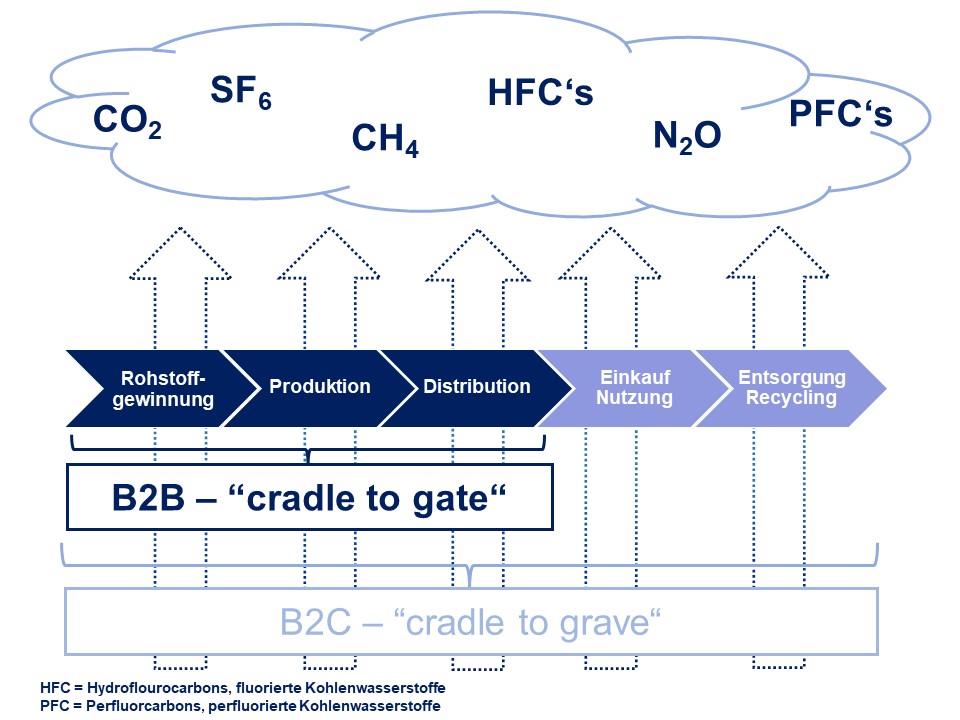 Zur Berechnung gibt es unterschiedliche Ansätze – in der Lieferkette (B2B) ist es sinnvoll PCFs innerhalb der Werksgrenzen (gate to gate) oder von der Wiege (Rohstoffgewinnung) bis zum Werkstor (cradle to gate) zu bestimmen.