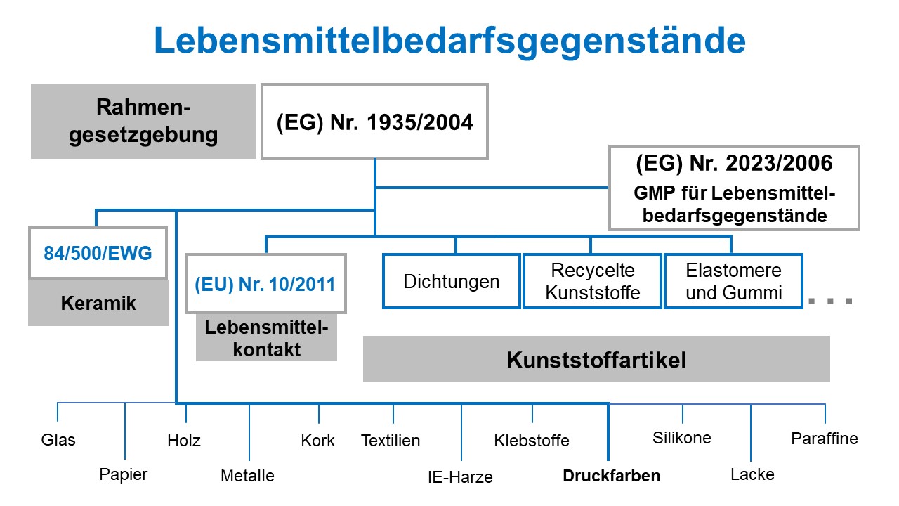 Die Anforderungen an Materialien und Gegenstände, die mit Lebensmitteln in Berührung kommen, sind bereits hoch. Eine Übersicht über die derzeitigen gesetzlichen Regelungen ist in der folgenden Graphik zu sehen.